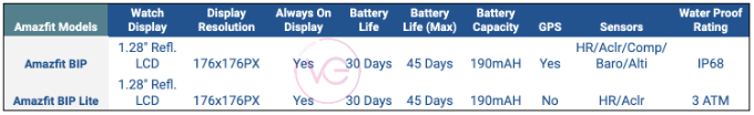 | Specification | Amazfit Bip | Amazfit Bip Lite |