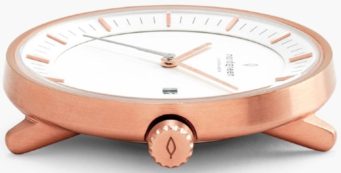 The minute and hour hands of the watch sport a baton design, which complement its minimalistic look. However, the second hand comes in a slightly darker color (grey in Nordgreen Philosopher Rose Gold). It features an asymmetric design, which makes it look like the second hand is slicing through time. There is a small date window in the watch as well, neatly located near the 03:00 o’clock mark.